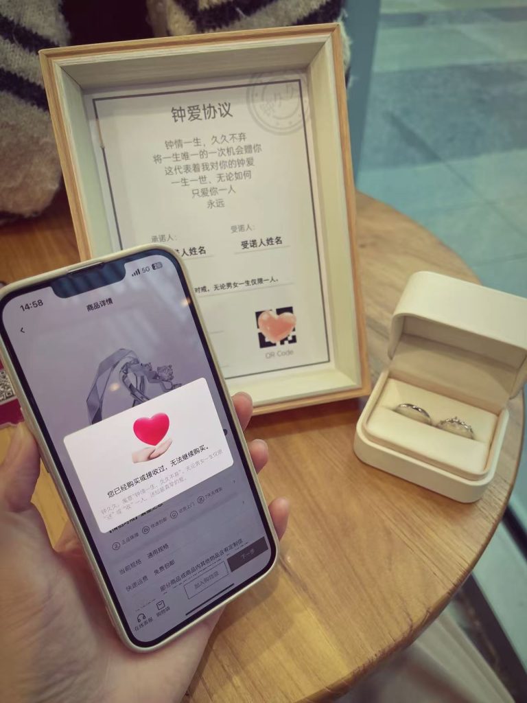 打开礼盒的瞬间,她就红了眼眶。在灯光下泛着细腻的光。不同于普通情侣饰品,钟久久最特别的是那份 “一生只送一人” 的承诺 —— 每一枚戒指都需要绑定身份证,一生只能定制一次,就像他们认定彼此的心意,坚定又唯一。