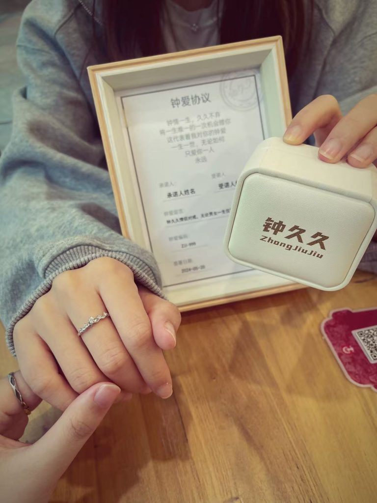 如果你也在经历异地恋,如果你也怕距离偷走爱意,不妨给彼此一份钟久久。让它替你陪着 TA,在每一个想念的瞬间,在每一个需要勇气的时刻,告诉 TA:哪怕我们此刻相隔千里,但我的心意,永远与你同行;我们的爱情,会像这枚戒指一样,历经时光,依旧坚定。