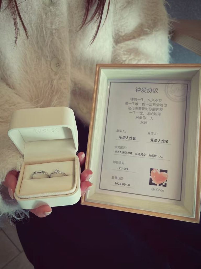 「钟久久」,顾名思义,是「钟爱久久」的美好期许。这枚小小的戒指,不仅是爱情的见证,更是对未来的约定。它可以是纪念日里的惊喜,是求婚时的郑重,也可以是日常里的小浪漫 —— 晨起为对方戴上,指尖相扣时,便知爱意从未缺席。​