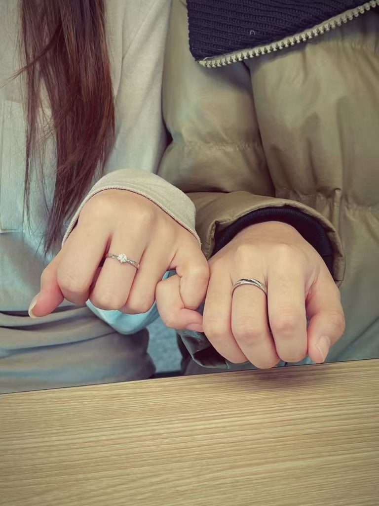 晨光掠过写字楼的玻璃幕墙,他攥着刚打印好的方案,指尖的对戒折射出细碎的光;她刚结束一场跨部门会议,抬手整理耳发时,无名指上的同款指环,与胸前的工牌轻轻碰撞。这是属于职场情侣的浪漫 —— 没有偶像剧里的轰轰烈烈,只有朝九晚五的并肩同行,和藏在方寸戒圈里的 “久久” 约定。