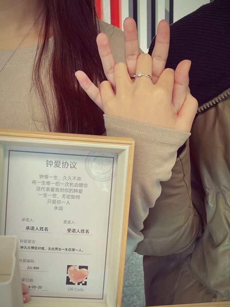 钟久久的设计师说,好的对戒,要经得起时光打磨。就像我们的感情,从初见的心动,到朝夕相伴的安稳,一点点被岁月焐热,变得愈发坚韧。简约的戒圈线条,没有繁复的装饰,却藏着最细腻的心思 —— 男戒的棱角利落,像你给的安全感;女戒的弧度柔和,像我依赖的温柔。