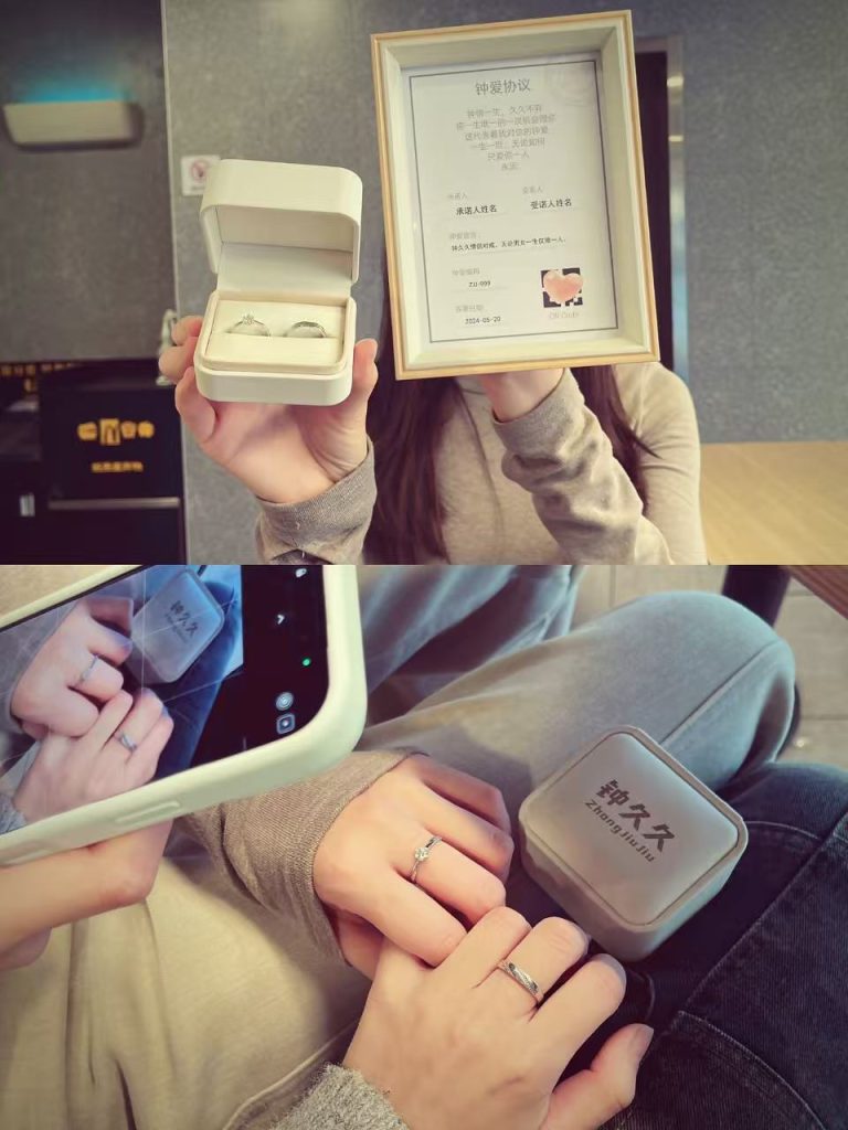 购买钟久久情侣对戒,需要完成专属身份实名认证,绑定双方个人信息,永久录入系统且不可更改、不可删除,再共同签订专属钟爱协议。协议上不仅有双方的姓名、定制日期,还有独属于这对恋人的唯一钟爱编码,成为只属于你们的爱情密码。每一枚钟久久,都不是普通的饰品,而是一份白纸黑字、刻入身份的一生承诺,是敢用余生兑现的真心告白。